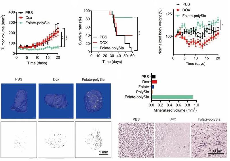 该分子由提供肿瘤细胞靶向性的叶酸分子和聚唾液酸高分子组成,其中的高分子链富含羧基,能够诱导体液中的钙离子的聚集。实验结果表明,该药物能诱导肿瘤细胞表面发生矿物沉积,形成一层壳状矿物结构,进而达到限制肿瘤细胞营养摄取和代谢的作用。正常细胞因叶酸受体表达较低,不能与药物发生结合,故而不受任何影响。