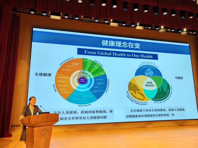 陈周闻老师首先从人类进化、个体命运中蕴含人类命运的角度,引发同学们对于生命的价值与意义的思考。她用“代偿、共生、免疫”三大关键词为同学们生动地诠释了疾病的概念。她告诉同学们,大健康理念要从聚焦疾病诊治到关注预防、治疗、康养的生命全周期,学会从被动应对转为主动预防。健康并不只是指躯体没有疾病,而是躯体健康、心理健康、社会健康、道德健康四位一体的共同健康。同时,地球生命休戚与共,青年一代学子更应该认识到人与自然和谐共生的重要性,建立全健康的概念。